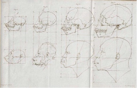 In the waning decades of the 18th century, the collection, trade, dissection and study of bodies and bones provided an anatomical basis for racial divisions. Anatomical analysis allowed for repeated observation and precise measurement, and was therefore considered more consistent than conflicting and hard-to-verify field reports. Since Hippocrates (470-360 BCE) in ancient Greece, physicians had studied the skull. But it was not until anatomist-artists such as Leonardo da Vinci (1452-1519), Albrecht Dürer (1471-1528), and, especially, Anders Vesalius (1514-1564) conducted systematic, empirical studies that variations in the shapes of skulls were finally recognized.4 The direct application of craniology to racial divisions traces to about 1770, when anatomist and artist Pieter Camper (1722-1789) devised the “facial angle,” to distinguish among different human races and apes.5 This angle is formed between a line coming from the forehead to the most projecting point of the jaw to a line coming from the ear to the bottom of the nose. A larger angle indicates a more vertical forehead and less projecting jaw, while a smaller angle indicates a more sloping forehead and more projecting jaw. For Camper, the higher European forehead and less pronounced jaw were closest to the (anatomically impossible) Greco-Roman ideal of beauty, while the African was furthest from this ideal and closest to the ape.6 The use of craniological methods to differentiate human races from one another, and to differentiate humans from animals, would remain the primary aims of craniology.