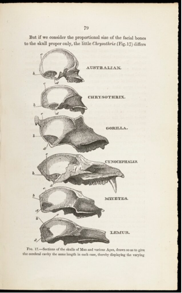 Charles Darwin’s (1809-1882) On the Origin of Species by Means of Natural Selection (1859) did not immediately change craniology and its claims about racial differences in intelligence.28 But, it did signal a shift such that theories like Morton’s, which relied heavily on a Biblical chronology (for example, in proving that racial differences go back to nearly the dawn of history, in ancient Egypt), were no longer plausible. Even so, craniological methods were still frequently used in racial classifications, and even Morton’s own writings helped shape evolutionary accounts of racial difference. Thomas Henry Huxley (1825-1895), who was the first to publish an account of human evolution with his Evidence as to Man’s Place in Nature (1863), used Morton’s research on brain size to show that the distance between the ape and the human was not so great, thereby making the evolutionary connection between humans and apes more plausible. Using Morton’s published measurements, Huxley asserted that the difference between the brain size of the largest Caucasian and that of the smallest Aboriginal Australian was greater than the difference between the brain size of the same Aboriginal Australian and a large gorilla.29