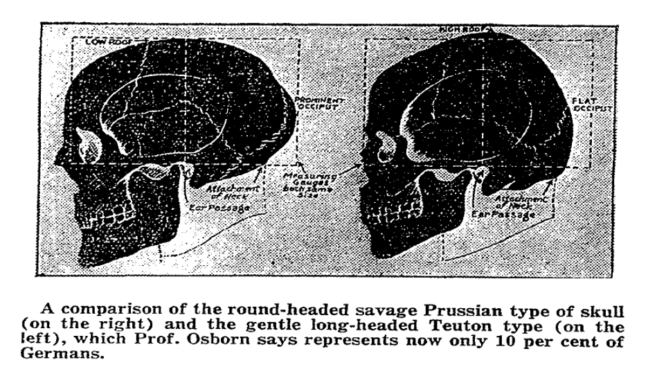 Not until Franz Boas’s (1858-1942) study of immigrant parents to the United States and their American born children, which showed that there was very low inheritance of the cephalic index, did discussion of racial characters of the cranium begin to recede.36 Once racial categories were recognized as changing through time, even in one generation, the older “typological” model of race which had characterized craniological study to that point became increasingly untenable.37 Even so, in the popular imagination, craniology remained an easy explanation for human differences. For example, in 1918 The Washington Post published an article entitled “Science Explains the Prussian Ferocity in War,” with contributions by American Museum of Natural History (New York) president and paleontologist Henry Fairfield Osborn and anthropologist William King Gregory. This article explained that “gentle” long-headed Teutons had become a minority in the German population, while round-headed “savage” Prussians, who inherited their barbarity from “oriental hordes” traceable to prehistory, accounted for German obedience to authority, brutality, and lack of morality: “‘As a man thinketh in his heart, so is he,’ says the Bible, and science adds that according to the shape of a man’s skull, so he thinks.”38 Despite its popular appeal and the imprimatur of prominent Anglophone naturalists as late as the interwar years, racial craniology would soon disappear in mainstream professional science.